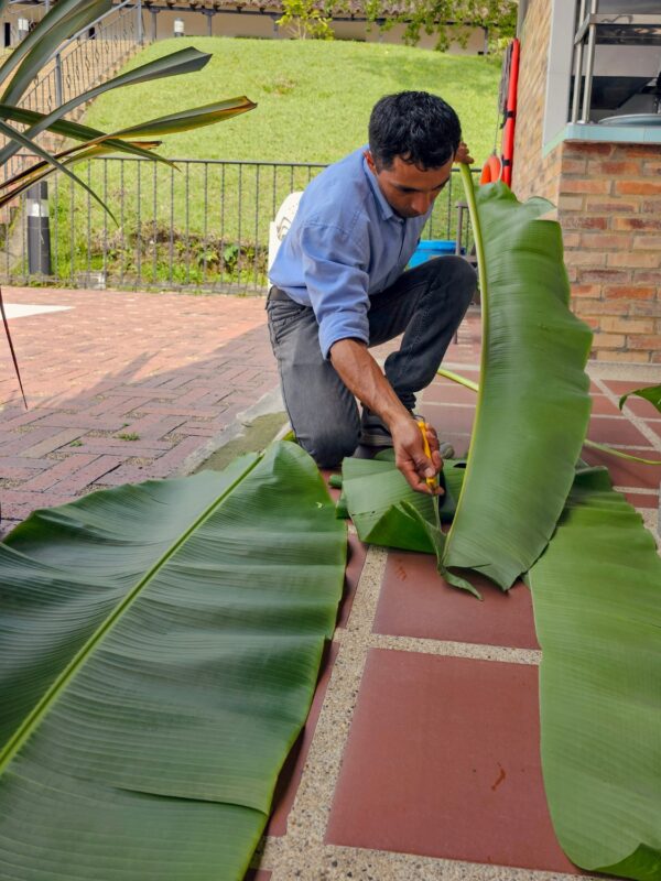 Para el almuerzo nos contaron la historia del fiambre, una combinación de varios alimentos envueltos en hoja de plátano. El recorrido y la comida se conectaron, y pudimos imaginar un día de trabajo gracias al plato típico de los campesinos en Colombia. Si bien lo alimentos ya estaban cocinados, cada participante tuvo la oportunidad de escoger la mezcla perfecta y crear su propio fiambre: arroz, plátano, papa, yuca, plátano maduro, pollo, cerdo, hogao.